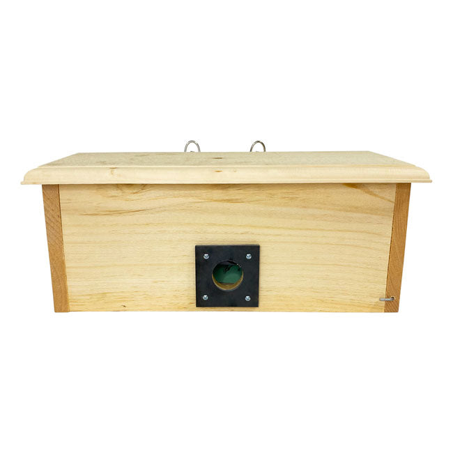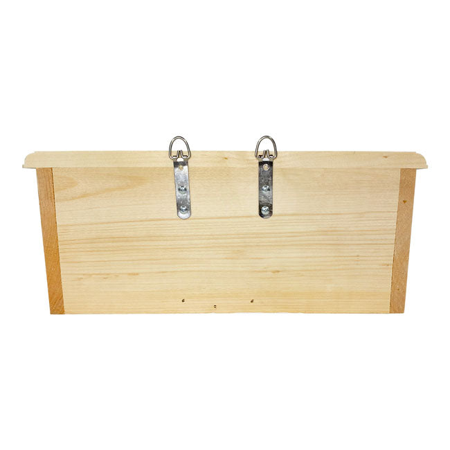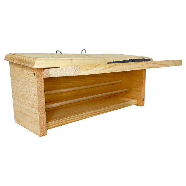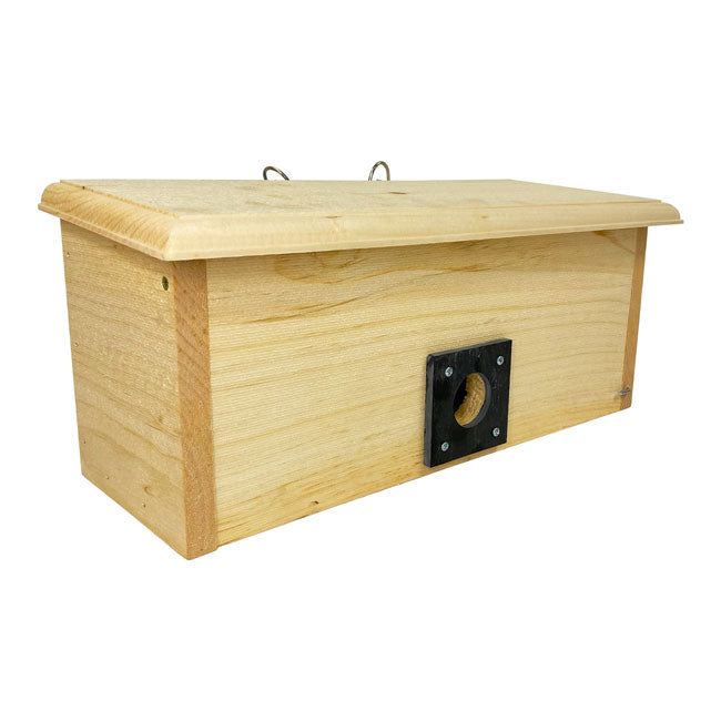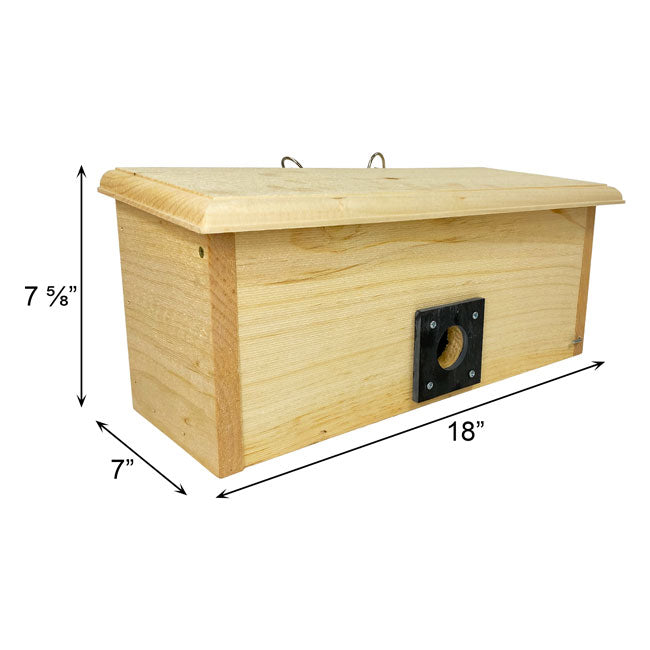 Offer songbirds a warm, cozy place to rest in the wintertime using the Coveside Horizontal Winter Roost. This comfortable abode features a 1.5" diameter opening at the bottom of the front panel for moderating the interior's temperature, and a protective slate guard prevents squirrels from enlarging it. As warm air rises, it is trapped inside the home rather than exiting through the entrance hole. A pair of extended perches inside the box offers room for several incoming birds to roost. The front of this handsome shelter lifts upward for easy cleaning and observation, while the "L" shaped metal hook keeps it securely closed. With a slanted roof to facilitate water runoff, this box will remain clean and unspoiled by the elements, and the included metal hangers allow easy mounting of this roost to a tree or post. Crafted from solid eastern white pine, this durable shelter will age to a beautiful gray hue, and will never need to be painted or stained. Help birds weather the bitter winter using this Horizontal Winter Roost. Made in the USA from solid eastern white pine.