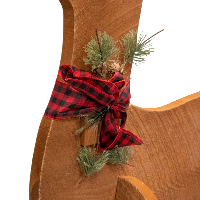 - Red and black, plaid bow with a pine bough adorns the neck for a touch of holiday cheer.